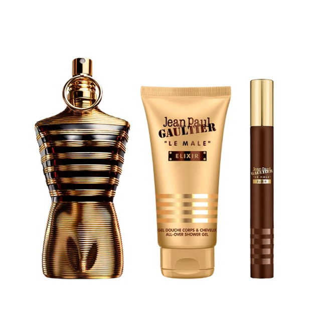 Jean Paul Gaultier Le Male Elixir 75ml Parfum Spray + 10ml Parfum Spray + 75ml All Over Shower Gel Gift Set